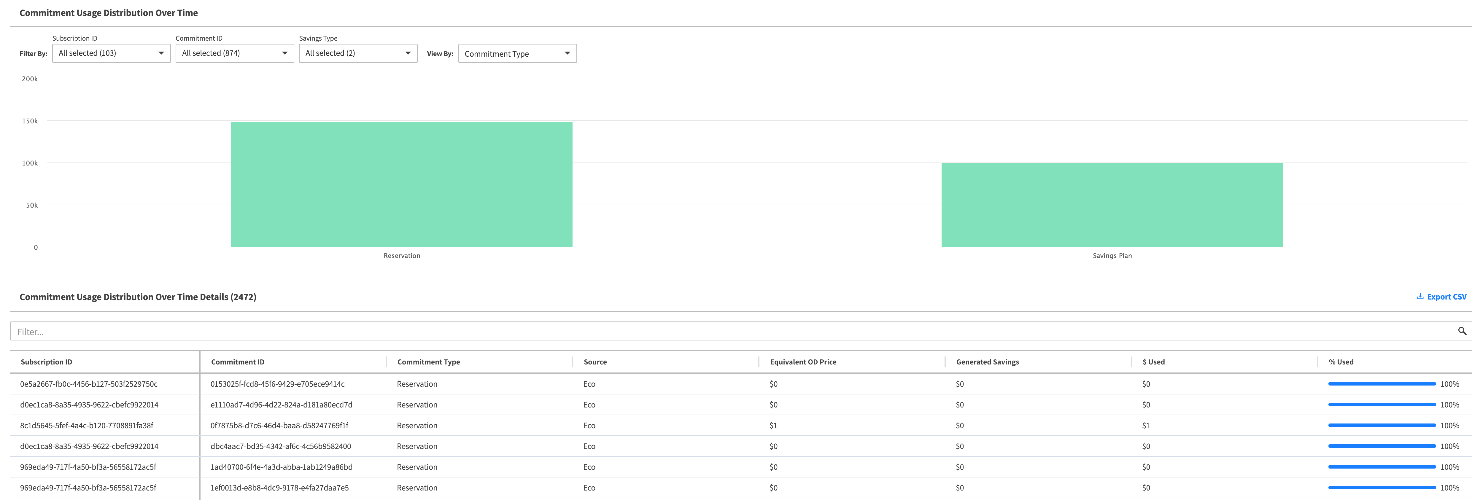 To export the Commitment Usage Distribution Over Time Details table to a CSV file, click Export above the table.